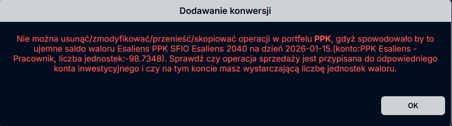 Przy ręcznej próbie (Operacje -> Konwersja walorów) mam komunikat dotyczący ujemnego salda na Esaliens PPK 2040 (zrzut w załączeniu).