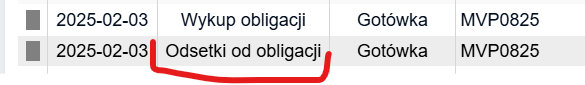 Zakup obligacji wprowadziłem ręcznie. System automatycznie wprowadził transakcję wykupu obligacji w sierpniu 2025. Ręcznie zmodyfikowałem datę na 03.02.2025. Ale system dodał "dodatkowe" odsetki za okres 02-08.2025 które już nie zostały wypłacone.
