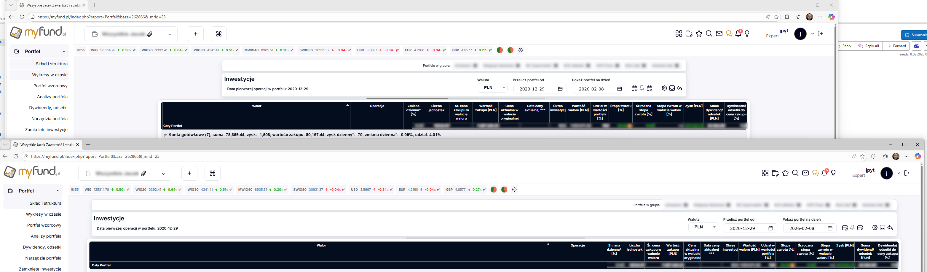 | 2026-02-08 17:25 17 wpisów 35 dni temu | PS. jeszcze do tematu szerokości kolumn. Z całą pewnością mogę Ci powiedzieć, że coś jest nie tak na poziomie zasadniczym. Na 100%, w portfelu grupowym (nie wiem jak inne), dostaję reset ustawień kolumn nawet jeśli w ogóle nie dotykam opcji tabeli. Po prostu ustawiłem rozmiar, zapisałem, otworzyłem stronę ponownie i tabela jest rozwalona. Rozwalona przy tym tzn. "Nazwa waloru" dostaje ogromne miejsce, nie mieszczą się pozostałe kolumny i są tak ściśnięte, że w środku następuje łamanie wartości. Nie dzieje się to zawsze i teraz jeszcze poszperałem i to ma jakiś związek z rozmiarem okna przeglądarki w jakim dokonywałem ustawień i zapisu i potem rozmiarem w jakim wróciłem do Myfund. Przy czym w pewnym zakresie rozmiarów jest ok, a przy pewnych następuje rozwałka. Zobacz zresztą na screenshot. Jest wykonany z tej samej zapisanej konfiguracji, bez żadnych zmian w opcjach tabeli. U góry okno i stan zapisania, u dołu po otworzeniu w nowej karcie/oknie przeglądarki. Jak już ustawiamy kolumny i zapisujemy to powinno być to według mnie bezwzględne - otwarcie w za małym oknie powinno powodować, że tabela wystaje na bok i kontent jest przewijany w poziomie. Załącznik: ![]() | |