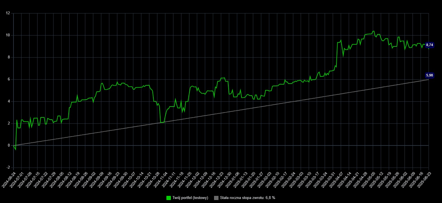 Chyba z tą stałą stopą coś nie tak - albo ja czegoś nie rozumiem. Mam jakiś tam portfel testowy, wpisuję daty 24.06.2024 do 23.06.2025 czyli równy rok, dodaję opcję wyświetlenia stałej stopy zwrotu na poziomie 6,8%. Stała stopa po roku powinna być równa... 6,8%, prawda? A na wykresie jest wartość 5,98%... Proszę o wyjaśnienie lub/i ew. poprawki.