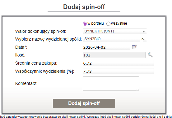 Dodanie operacji będzie z ceną wynikające z iloczynu średniej ceny zakupu akcji spółki dokonującej spin-off i współczynnika wydzielenia.