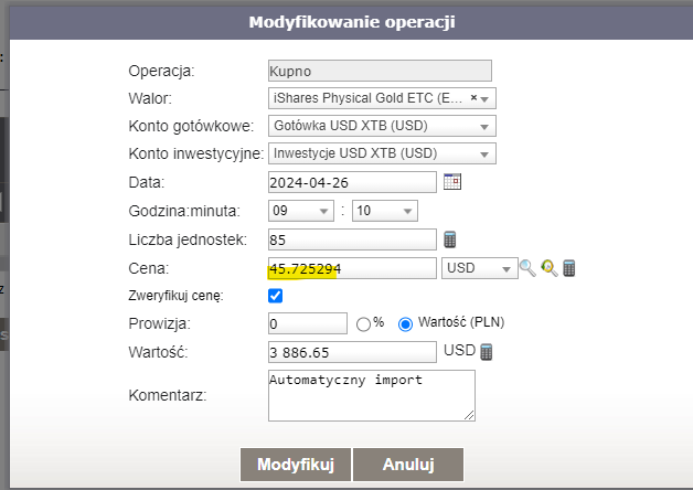 Niestety, przy zakupie w innej walucie niż notowana, XTB nie podaje tego do wiadomości, stąd myFund policzył 45,7253 za jednostkę.
