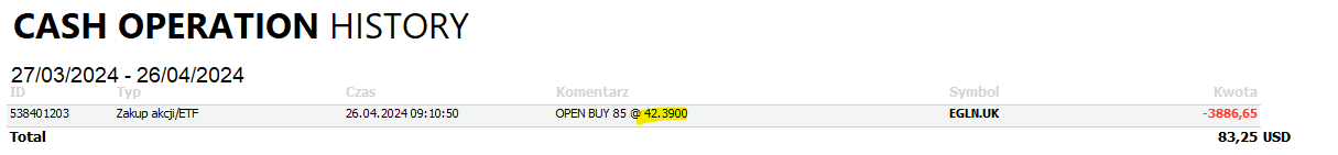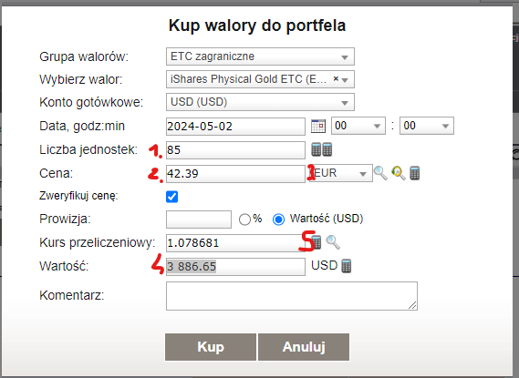 na portfelu notowanym w PLN zakupiłem jednostki instrumentu EGLN.UK notowanym w EUR. Zakup został zrealizowany w XTB kupując EGLN.UK za USD. XTB przeliczył zgodnie z kursem USD/EUR.