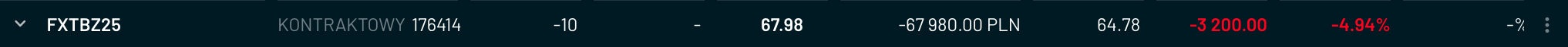 | 2025-10-31 07:58 10 wpisów 101 dni temu | Tylko właśnie kompletnie mi się nie zgadza wartość tego kontraktu. Mam 10 kontraktów o wartości łącznej -67 980 pln, a w myfund wgl nie pokazuje mi się taka suma - albo za duża, albo za mała (ale nawet nie zbliżona) Załącznik: ![]() | |