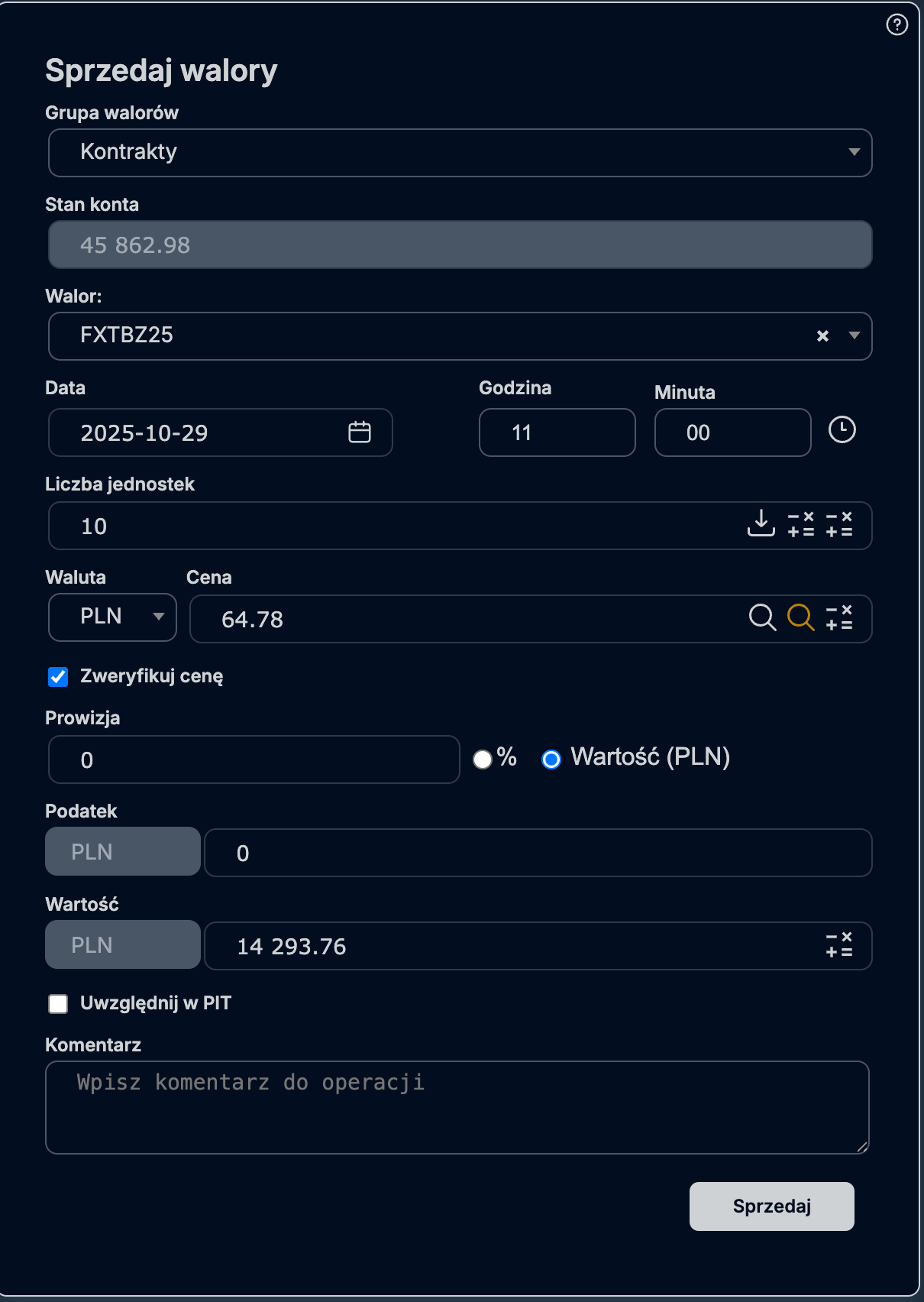 | 2025-10-31 07:07 11937 wpisów 102 dni temu | Cześć, To jest jeszcze prostsze bo dodajesz po prostu sprzedaż waloru z menu->Operacje->Sprzedaż walorów. Pozdrawiam, Damian | |