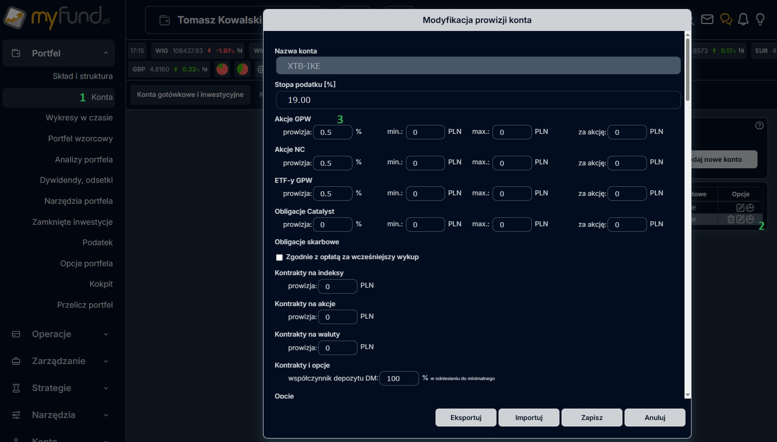 | 2025-11-18 17:51 2 wpisy 22 dni temu | Dodatkowo uzupełnij prowizje dla danego konta. XTB pobiera 0,5 %, wpisz tę wartość w polu dotyczącm Twoich aktywów. Wartości z XTB nigdy nie będą pokrywały się w 100% z myFound ale moim zdaniem różnica jest akceptowalna. Załącznik: ![]() | |