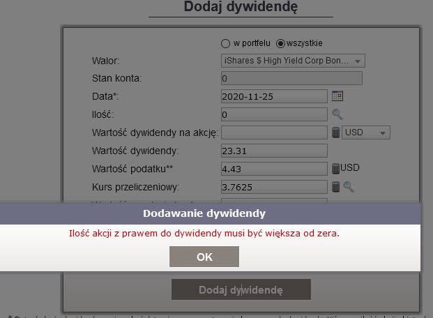 | 2020-11-25 14:53 30 wpisów 1938 dni temu | Dostałam dziś dywidendę z indeksu iShares USD High Yield Corporate Bond, którego pozycję zamknęłam parę dni / tygodni temu. Wygląda na to, że nie da się po prostu wpisać wartości dywidendy, bo dostaję komunikat, że ilość akcji musi być większa od 0 - jak w zalączniku. Poproszę o pomoc. Dziek. Załącznik: | |