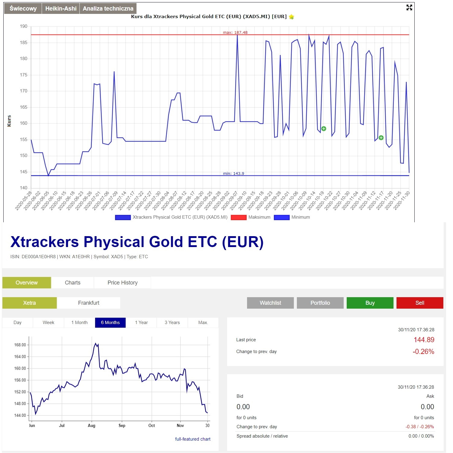 Wykres cen waloru XAD5.MI zachowuje się bardzo dziwnie, nie pasuje to nijak do wykresu, który można zobaczyć na stronie giełdy (https://www.boerse-frankfurt.de/en/etf/xtrackers-physical-gold-etc-eur) (załączam zrzuty ekranu). Przekłada się to także na obliczenia wartości portfela, np. dzisiaj ten walor pokazuje mi w portfelu zmianę dzienną -16.41%, podczas gdy na na stronie giełdy jest to -0.26%