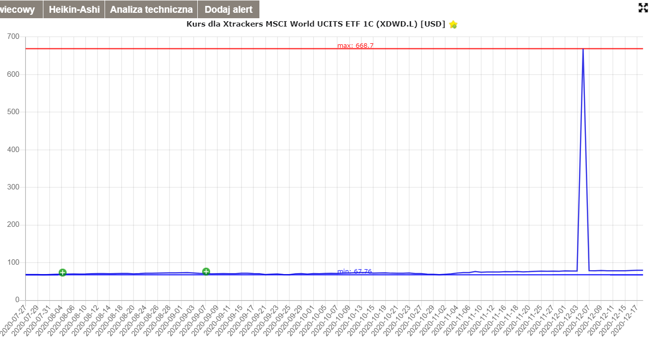 Dla waloru XDWD.L na wykresie ceny występuje dziwny pik, który przenosi się na wycenę mojego portfela. Ostatnio przy podobnym problemie z innym walorem pomogła zmiana źródła danych.