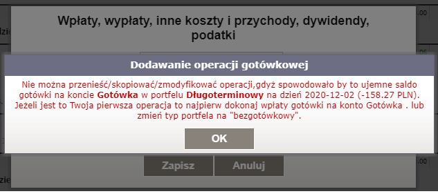"Nie można przenieść/skopiować/zmodyfikować operacji,gdyż spowodowało by to ujemne saldo gotówki na koncie Gotówka w portfelu Długoterminowy na dzień 2020-12-02 (-158.27 PLN).