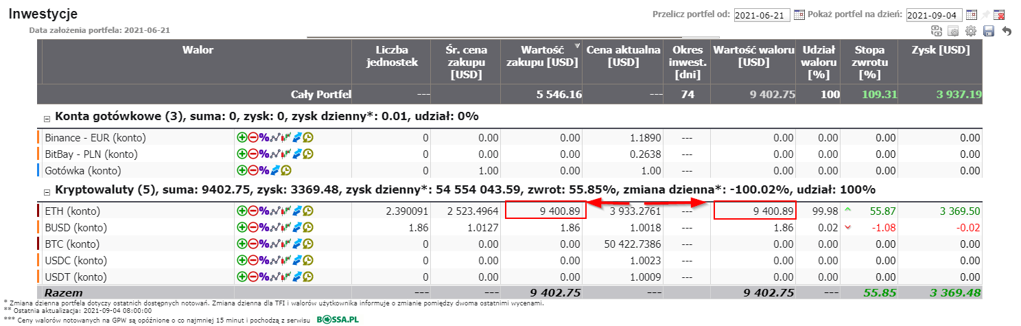 Prowadzę portfel krypto w sposobie kont gotówkowych. Zakupiłem ETH jakiś czas temu i urosło znacznie. W kolumnie "Wartość zakupu" i "Wartość waloru" cały czas są to równe wartości. Wygląda to tak jakby wartość waloru była kopiowana do wartości zakupu. Bo wartość waloru jest poprawna.