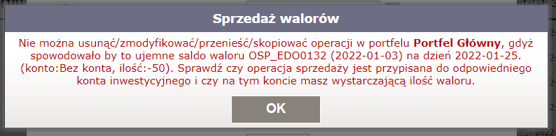 "Nie można usunąć/zmodyfikować/przenieść/skopiować operacji w portfelu, gdyż spowodowało by to ujemne saldo waloru OSP_COI0424 (2020-04-29) na dzień 2021-05-25.(konto:ObligacjeSkarbowe, ilość:-100). Sprawdź czy operacja sprzedaży jest przypisana do odpowiedniego konta inwestycyjnego i czy na tym koncie masz wystarczającą ilość waloru."