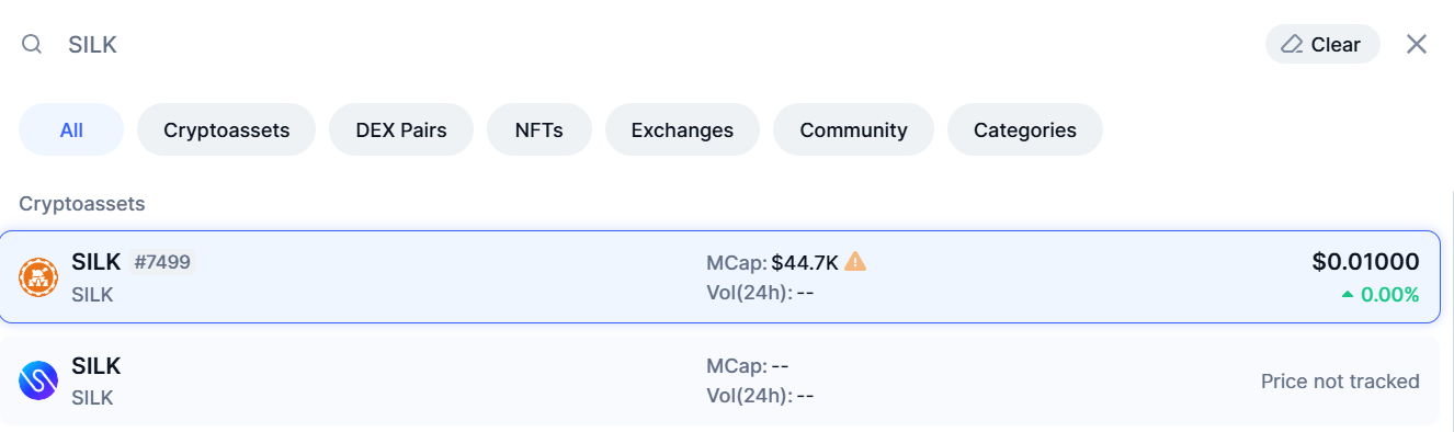 | 2025-06-06 13:58 12121 wpisów 284 dni temu | Cześć, Wyceny kryptowalut w myfund.pl są od coinmarketcap. Ale oni wyceny tej kryptowaluty nie śledzą: https://coinmarketcap.com/currencies/silk-shadeprotocol/ Poza tym są dwie kryptowaluty o tej nazwie - zobacz załącznik. Czy to jest jakaś nowa kryptowaluta? Bo jak tak to może za jakiś czas będzie cena w coinmarketcap. Damian Załącznik: ![]() | |